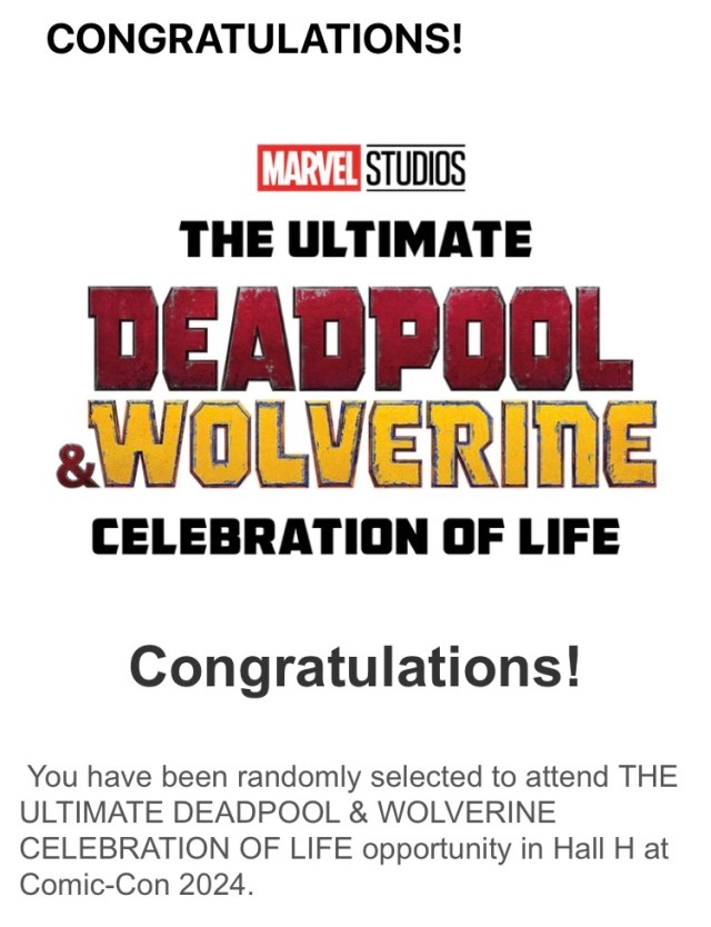 I’ve never had much luck in the Comic Con lotteries and found out that this Deadpool & Wolverine lottery was open for entries after the fact. I almost missed out. I didn’t think I would have chance of winning this but I submitted a google form entry anyway and didn’t include a plus one option. My rationale for not selecting a plus one was because I thought somehow I would have better odds of being chosen if I was going solo. After I submitted my entry I immediately forgot about it until a few days ago when I received notification that I had been randomly selected to attend this Celebration of Life event.