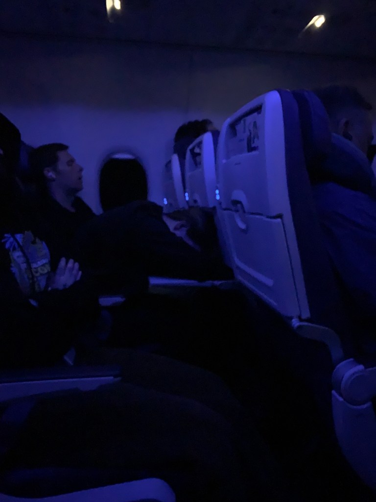 [7:35am] I walk from the D/E terminal to the end of A (A24) as my flight was beginning to board group 5. It’s easily a fifteen minute walk. I glide through the priority lane and make it to my empty row. I drop my bag in my seat and hit the bathroom real quick before taking my seat and settling in for the long flight. I decide to wear a mask on the plane, because why not? I will be surrounded by thousands of people soon enough but for right now I want to give my immune system a little rest while I sit in the middle of a completely sold out plane.