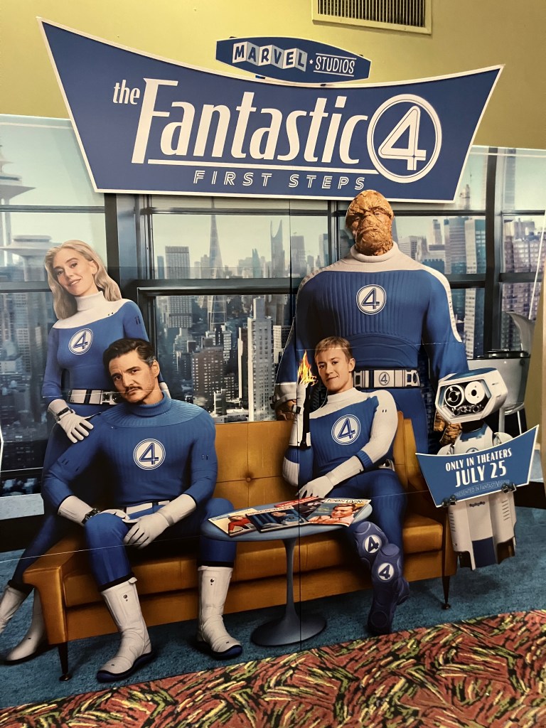 [8:16pm] I head out to see the new Fantastic Four movie. Along the way, my Uber driver, Mandy*, tells me that she used to work for at signature FBO and used to see all the stars coming and going. She boasts that she used to see stars such as Kevin hart, Megan fox and her ex, MGK… Shakira is tiny, and The Rock is huge and so charming. She takes both hands off the steering wheel to show me that his legs are “THIS BIG.” I am slightly terrified that we are going to crash on the 8 freeway … As I arrive at the mall I see the D23 attendees leaving the theater with nice tote bags in tow. I also notice people waiting outside in a line along the wall of the theater. Perhaps they are waiting to see FF in IMAX. I’m going to see the movie on a regular screen tonight and hope that no one spoils the movie for me as I’m walking inside the building. Fortunately, no one does…