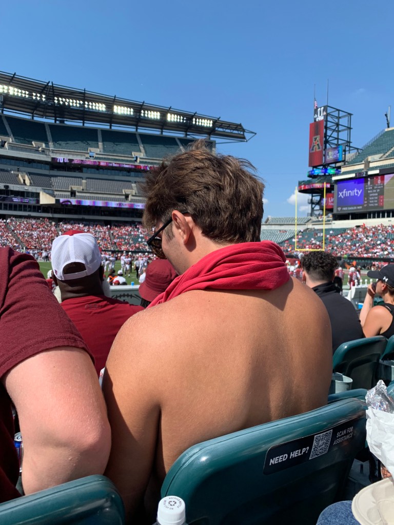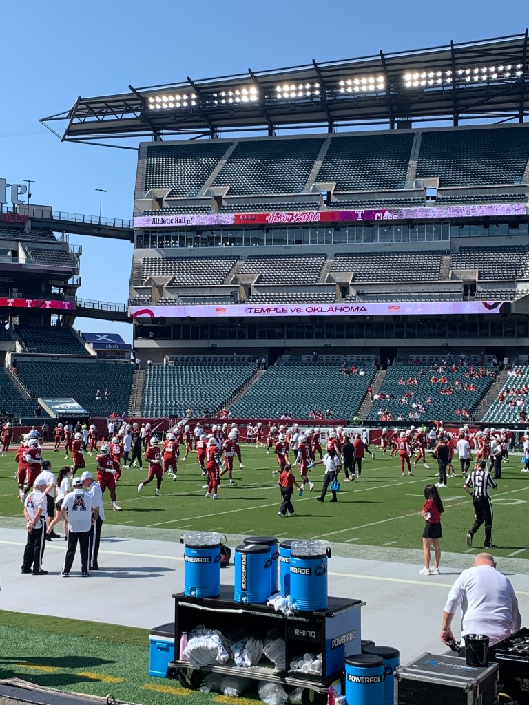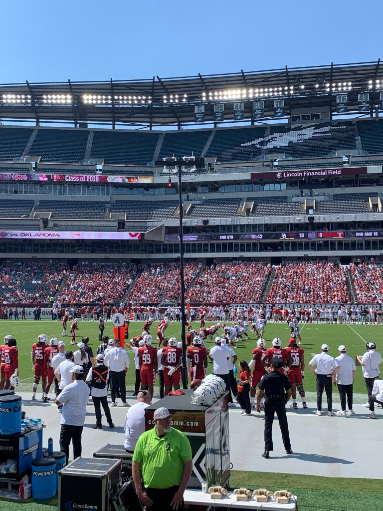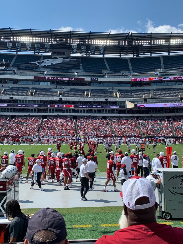 It’s a beautiful day for some college football!Let’s go, Temple FootballI love the design of the Temple endzonesStella the Owl!Out here with my CPE team seated directly next to me. Can’t beat these seats… Near the 50 yard line, three rows back! These same seats for an Eagles game would cost $$$$Oklahoma made the trip from Norman to Philly! What a rare treat to see an SEC game in Philadelphia. This guy had such an ingenious idea. Wear the t-shirt through the stadium and then…Remove the shirt and wear it around the neck to try and cool off/get some sun…Temple ended up getting spanked 42-3. I left early to beat the rush.Still can’t believe those Eagles won two Superbowls during my time in Philadelphia! Making my way back to the crib to watch the rest of the Clemson upset!